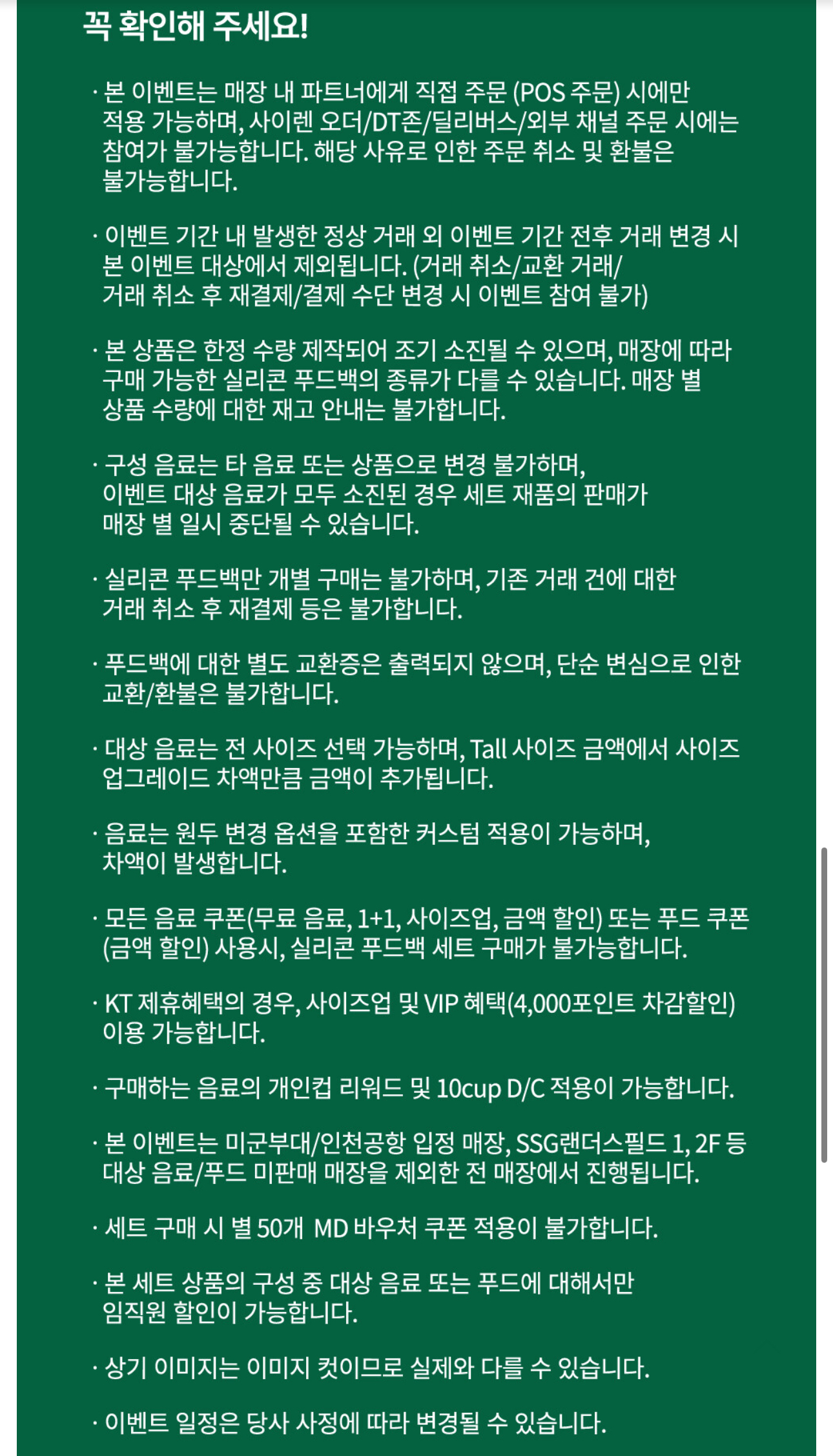 - 사이렌 오더, DT존 (드라이브 스루), 딜리버리 등 외부 채널 주문 시 구매 불가합니다. 이 점 꼭 기억해 주세요!
