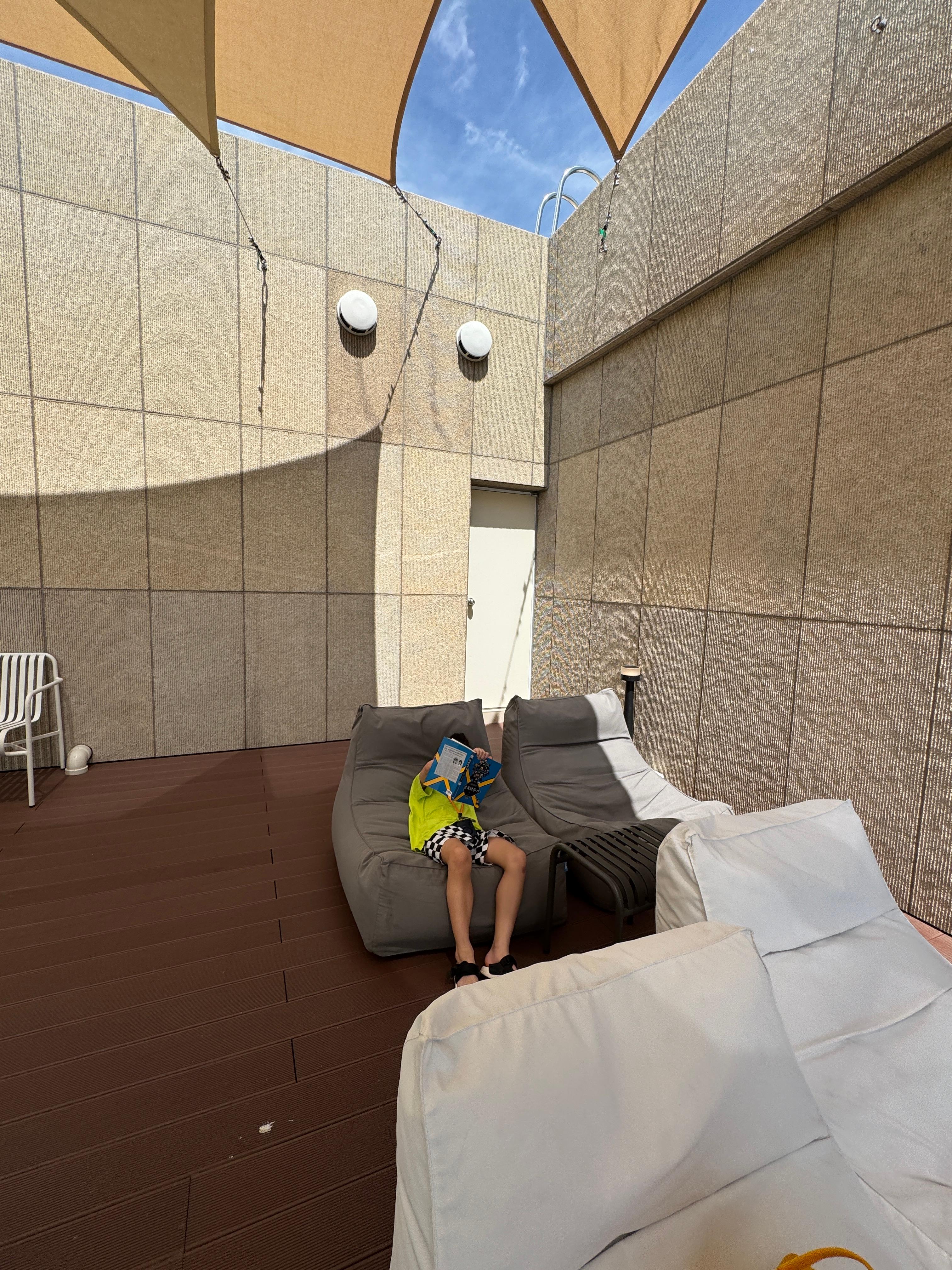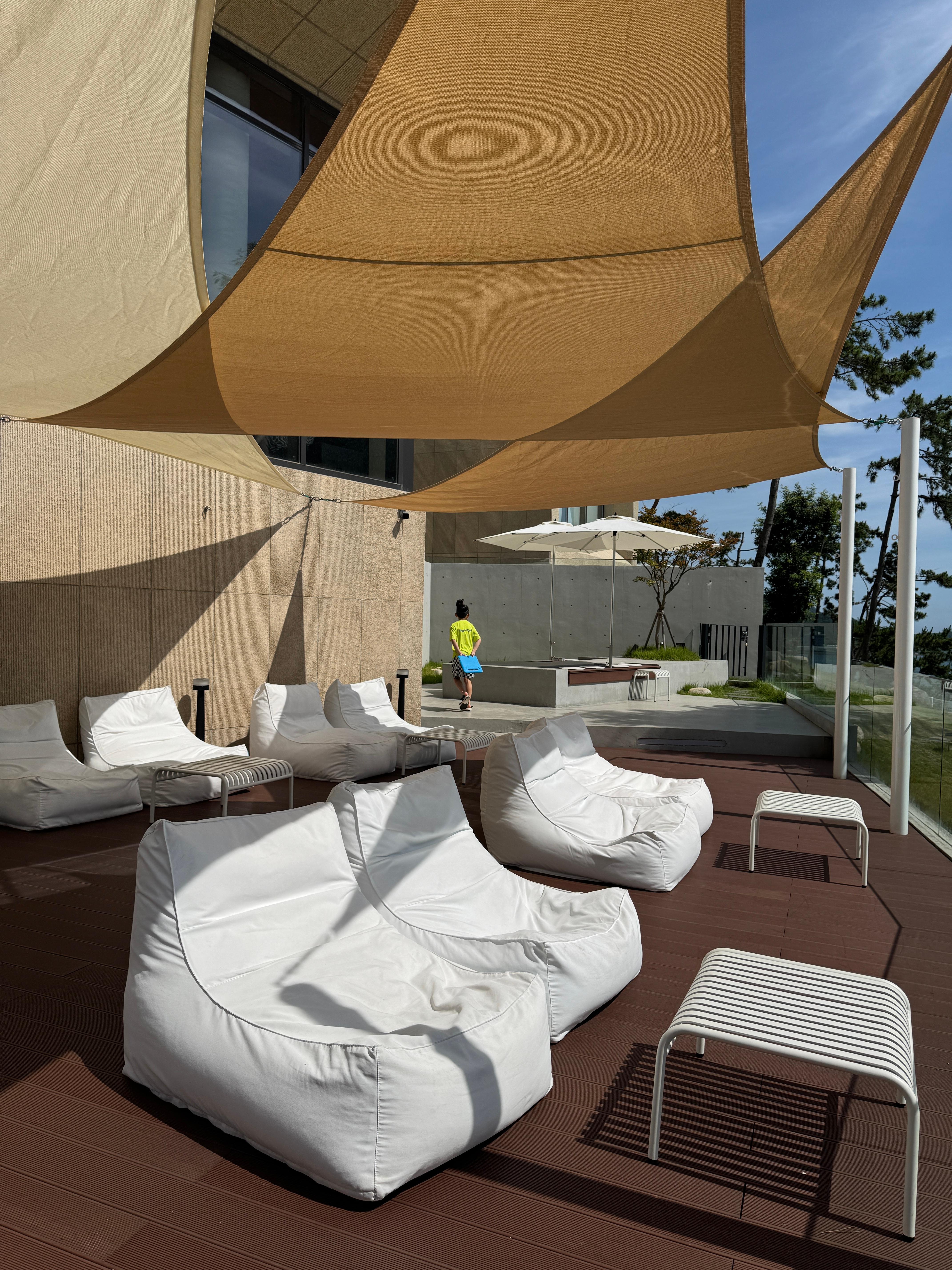 또한, 세븐아일랜드는 실내뿐만 아니라 실외 공간도 멋지게 꾸며져 있습니다. 한 방문객은 중간에 아이를 데리고 실외 공간에 나가 사진을 찍기도 했습니다. 우리가 방문했던 7월은 너무 더워서 실내에만 머물렀지만, 봄, 가을에는 시원한 바람을 맞으며 실외 좌석에 앉아 바다를 보면서 시간을 보내는 것도 정말 좋을 것 같습니다. 인생샷을 남길 수 있는 아름다운 포토존이 가득합니다.